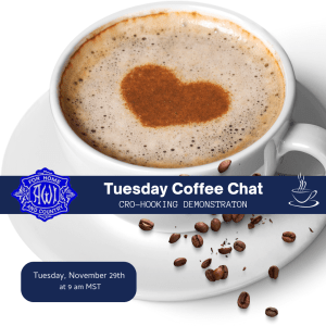 This month’s Tuesday Coffee Chat is on Tuesday, November 29th at 9 am MST. Topic is Holiday Catchup and Cro-hooking project progress. To register and get the Zoom Link, go to our Online Learning Page.